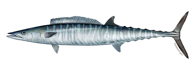 Wahoo have a long, streamlined body with a pointed head and sharp teeth. They are typically silver with bold vertical blue stripes along their sides, which are especially visible when the fish is fresh.
